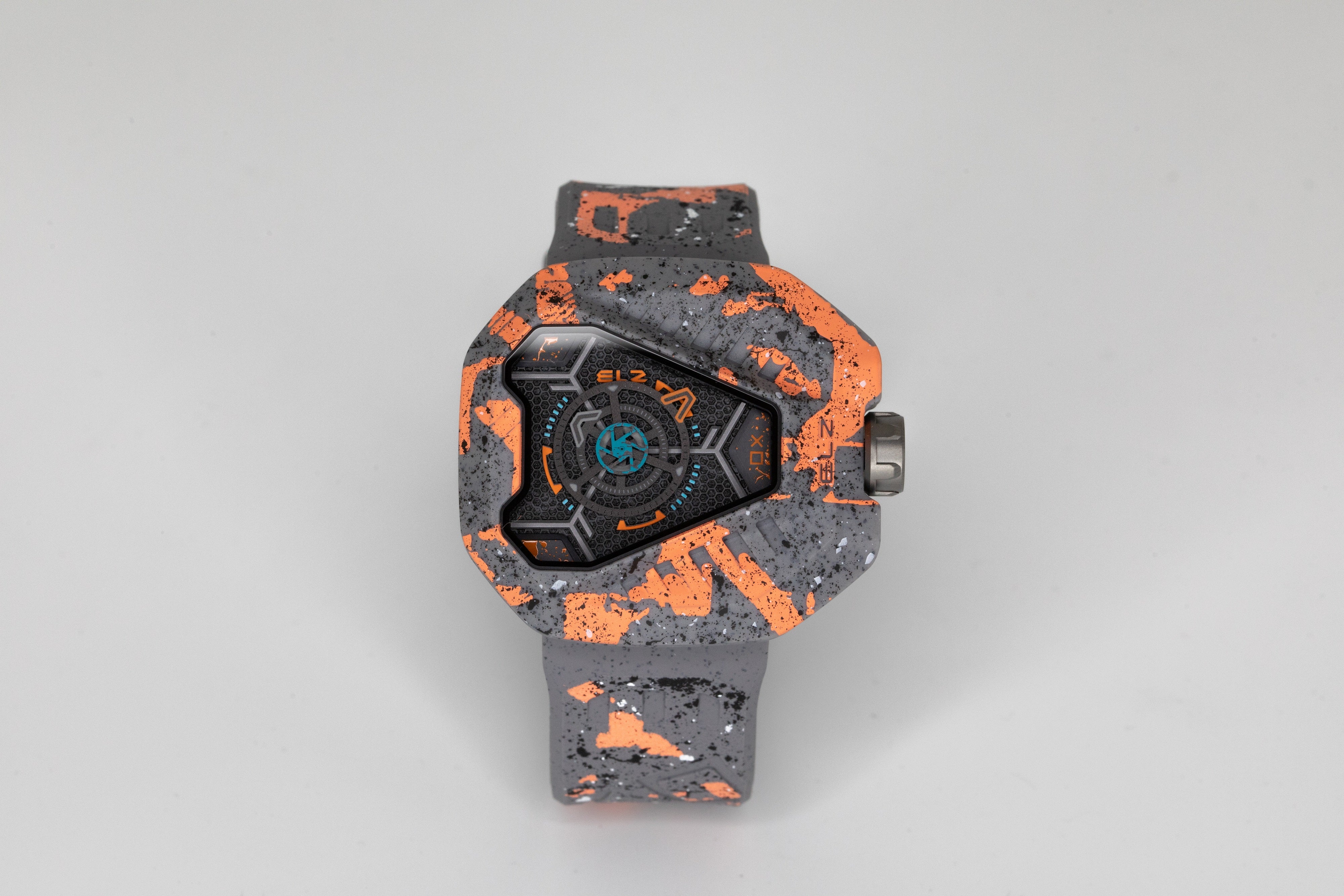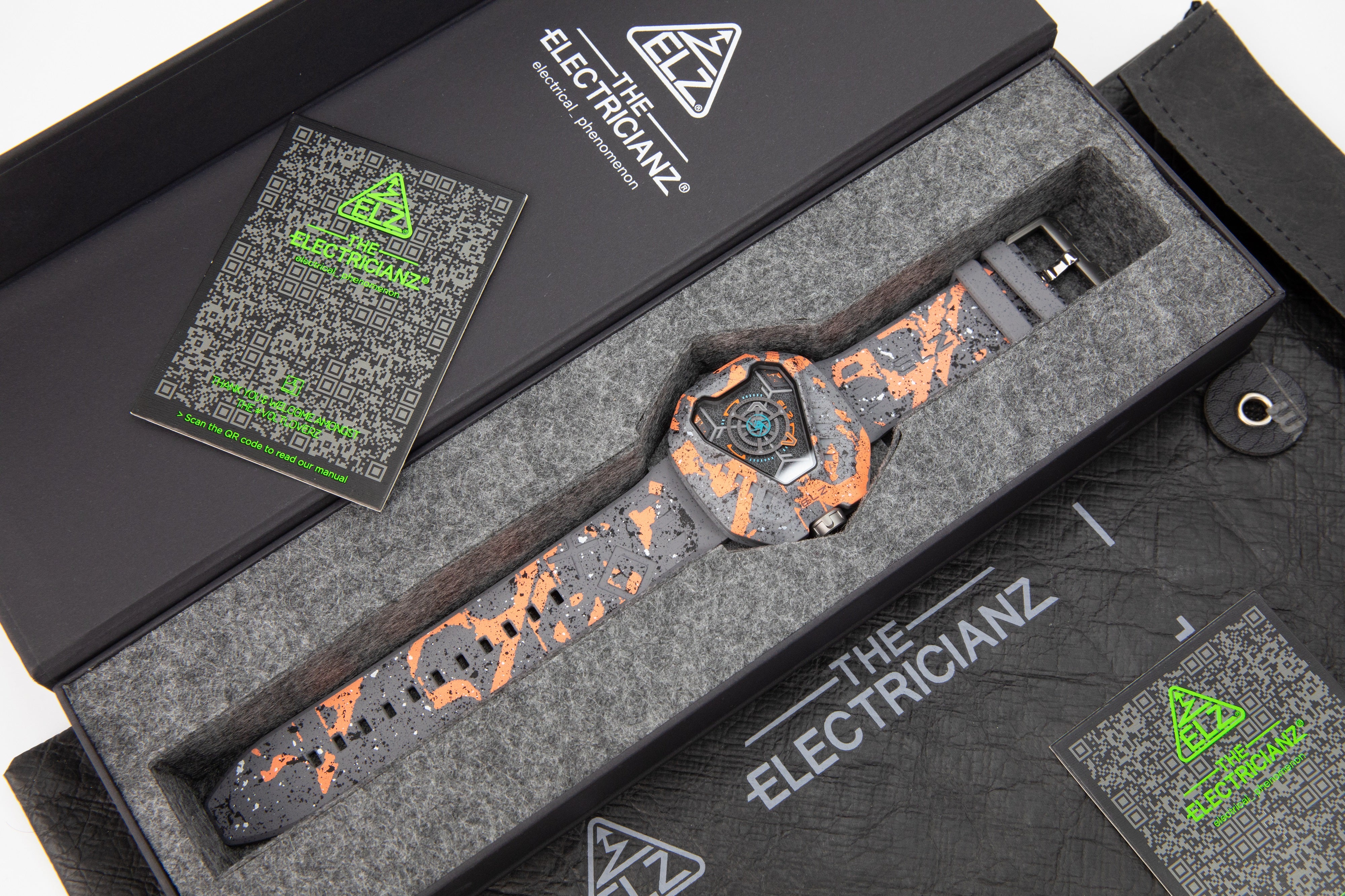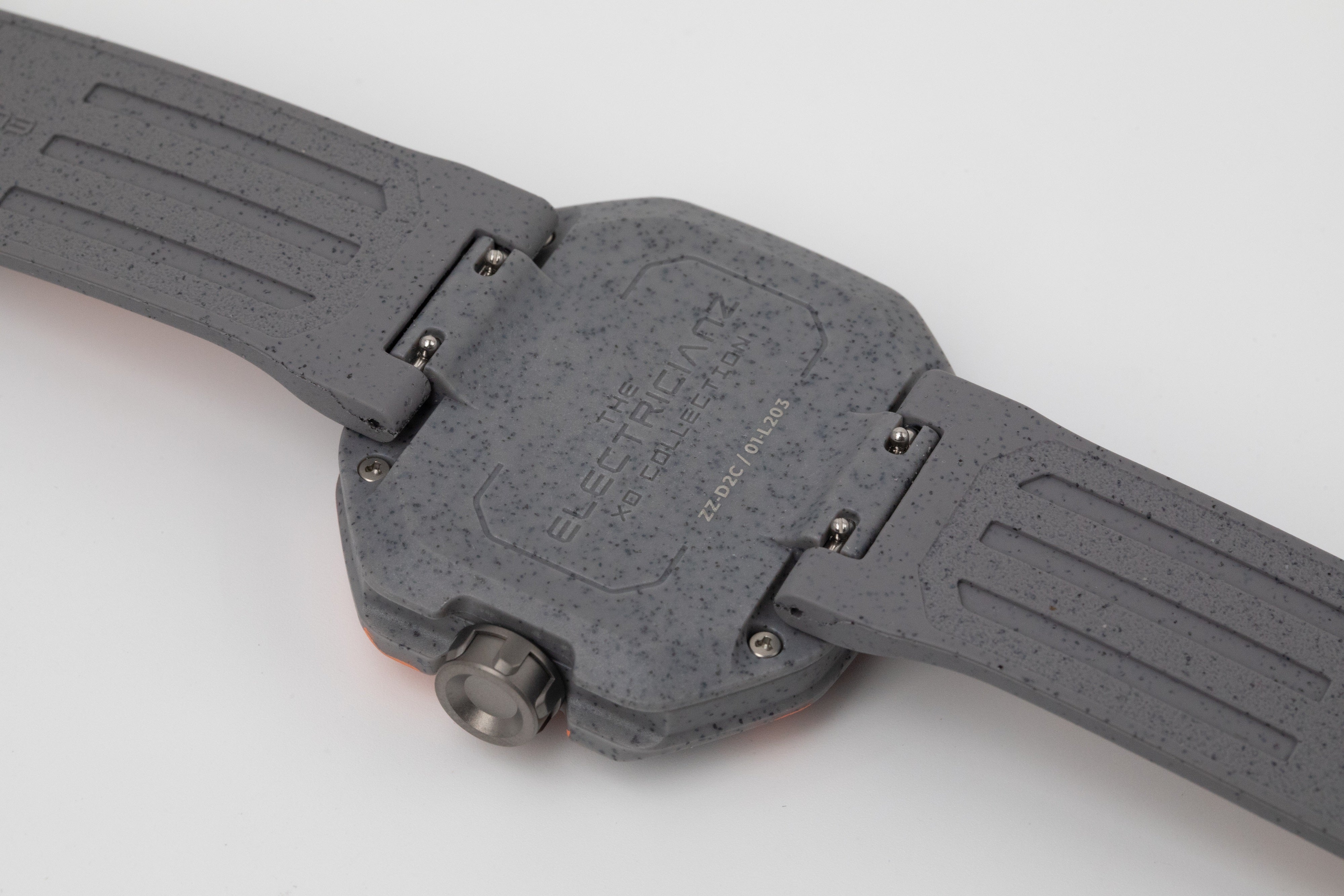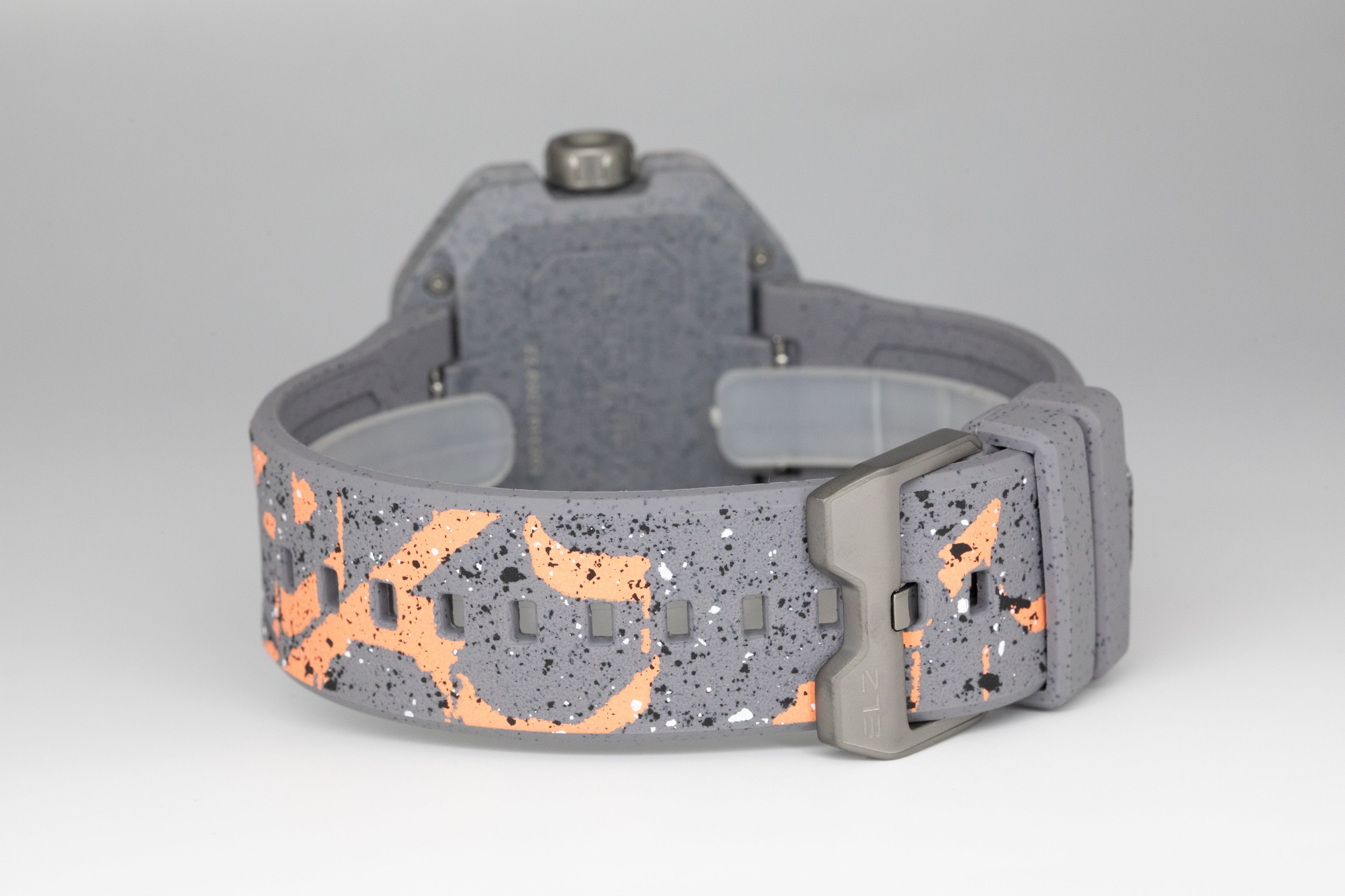 - لون الحزام رمادي مع طبعات النيون البرتقالية