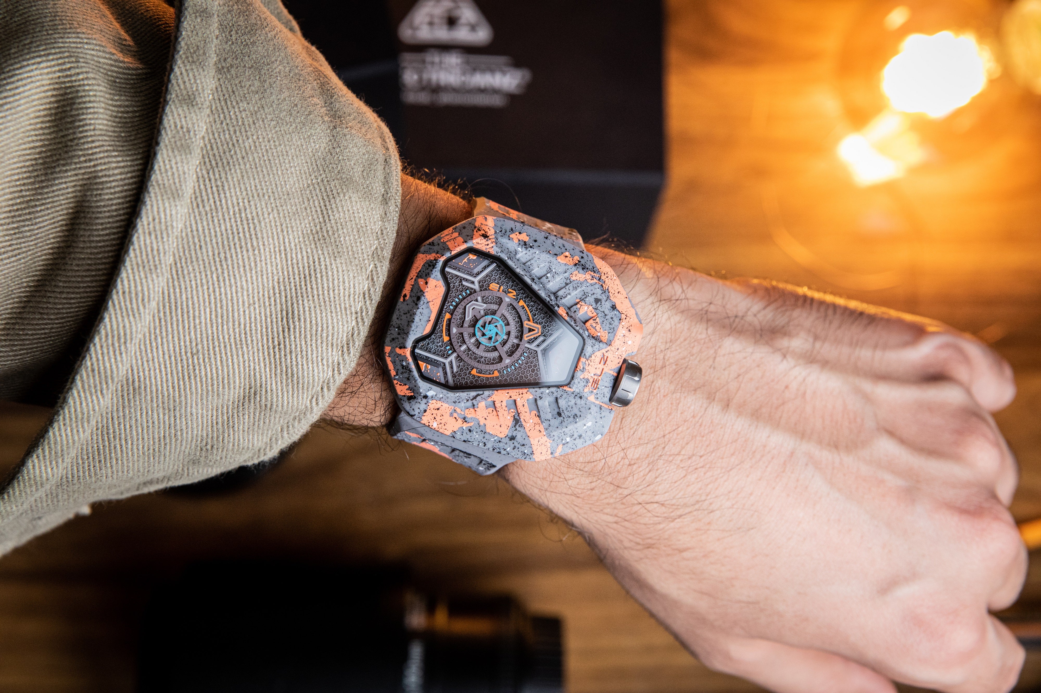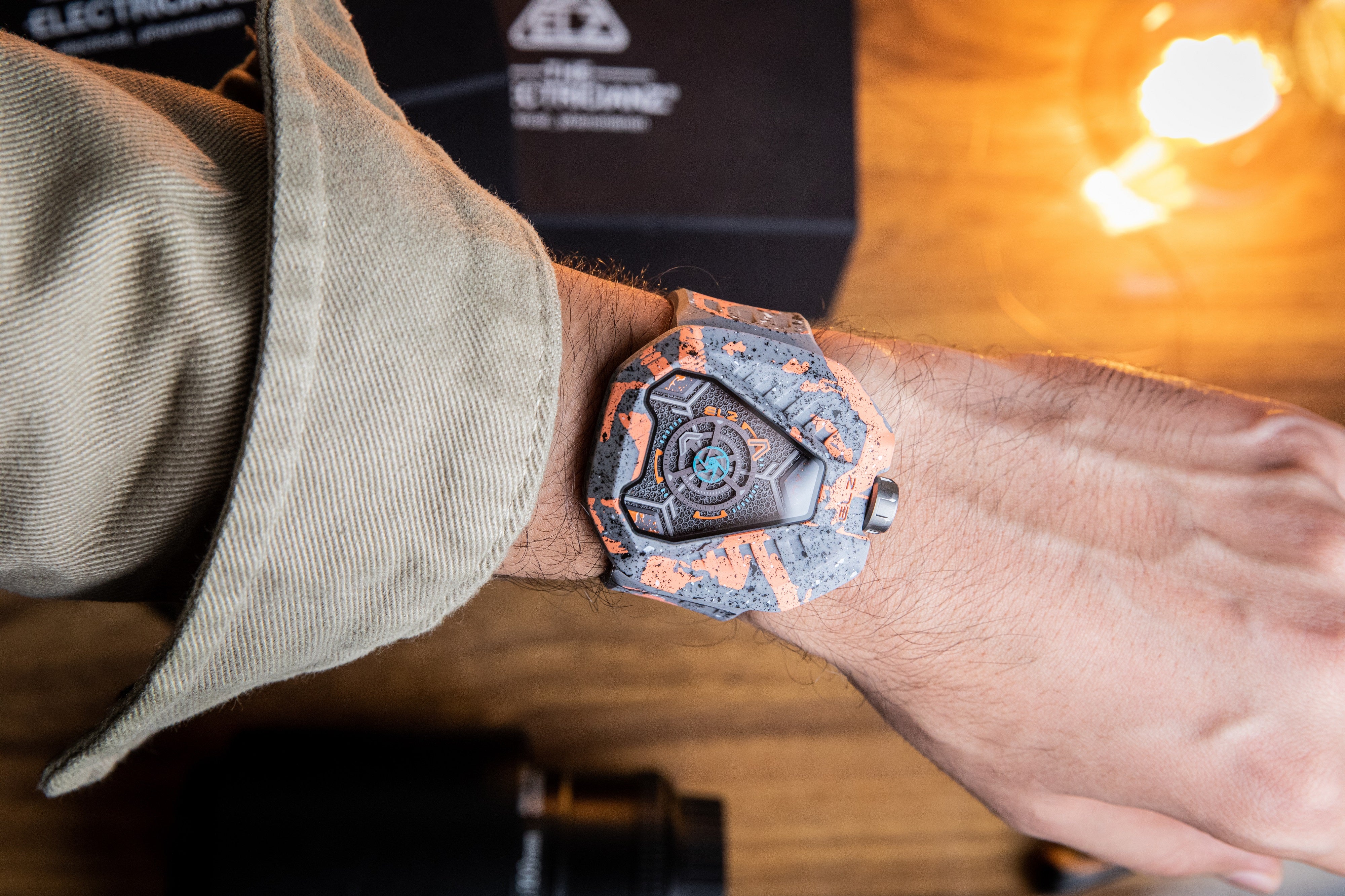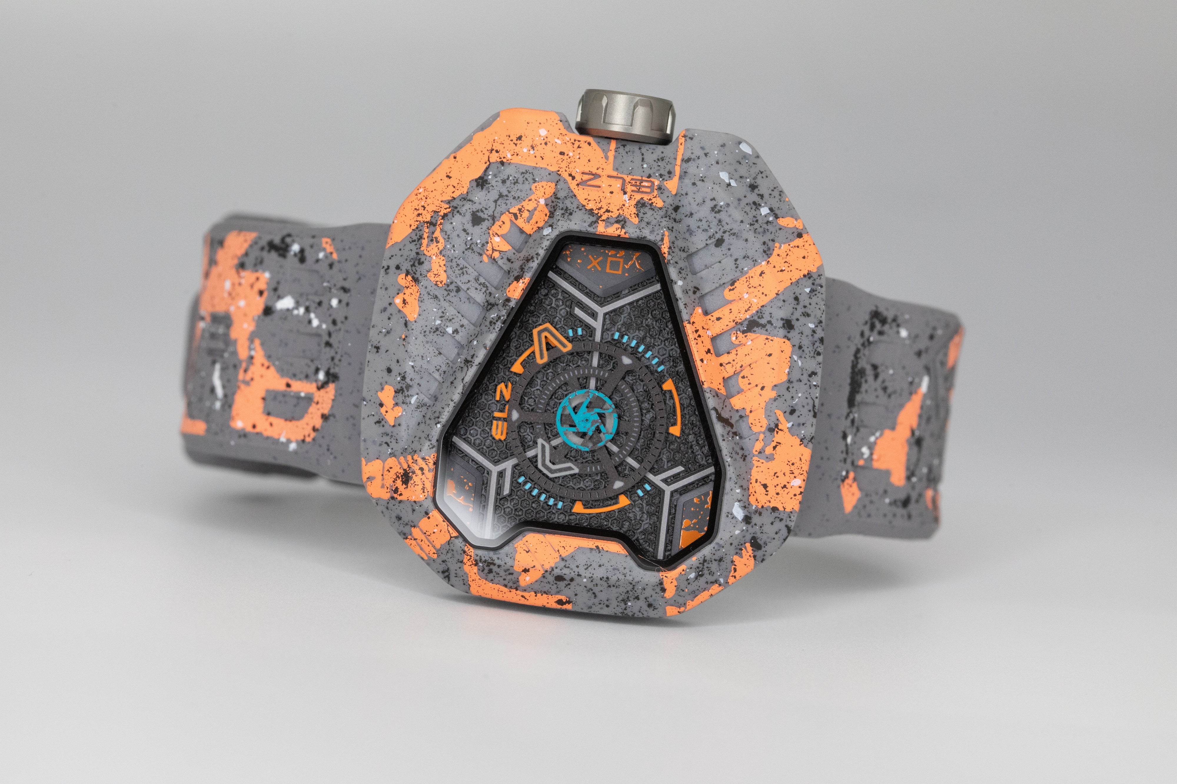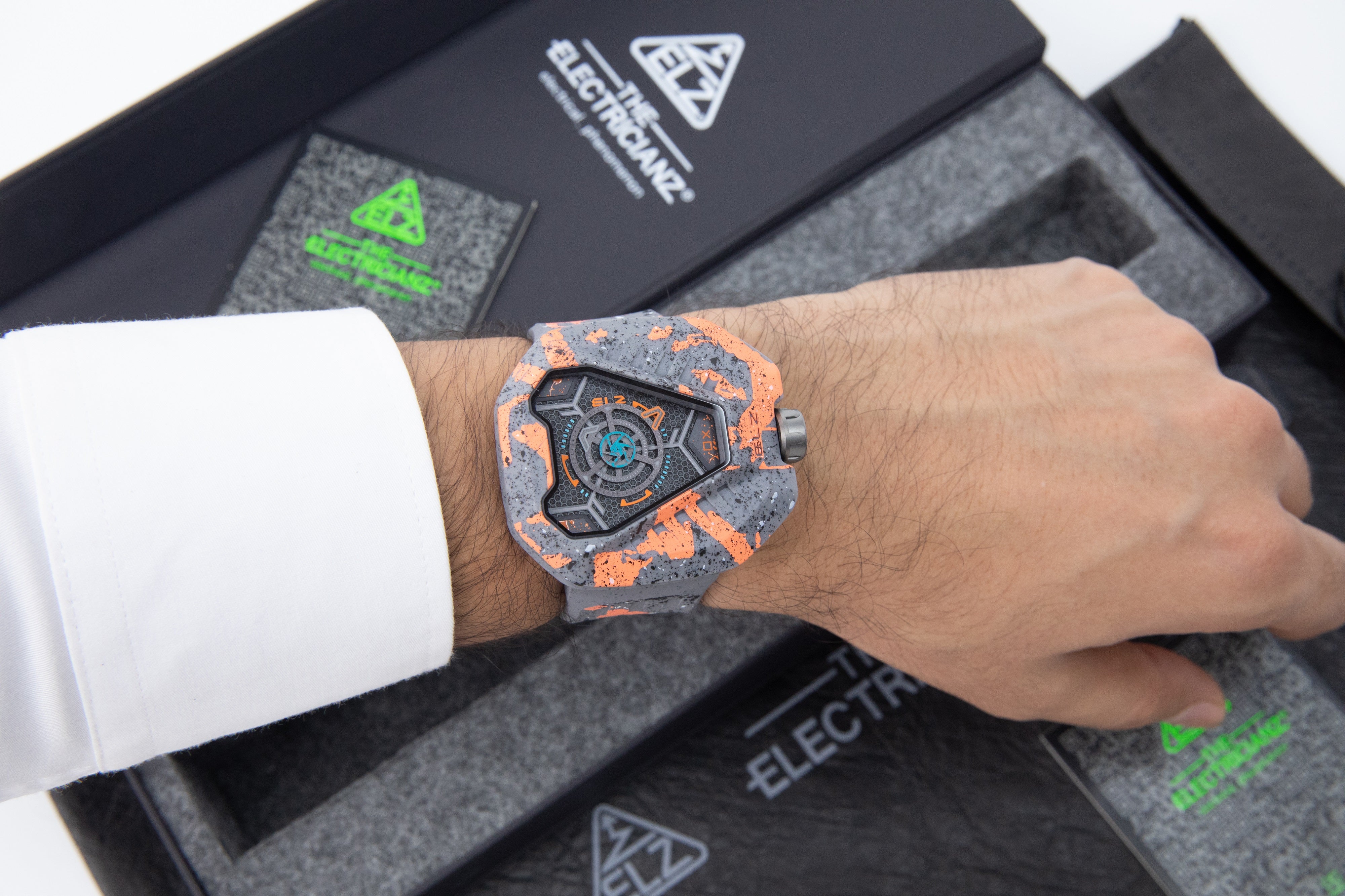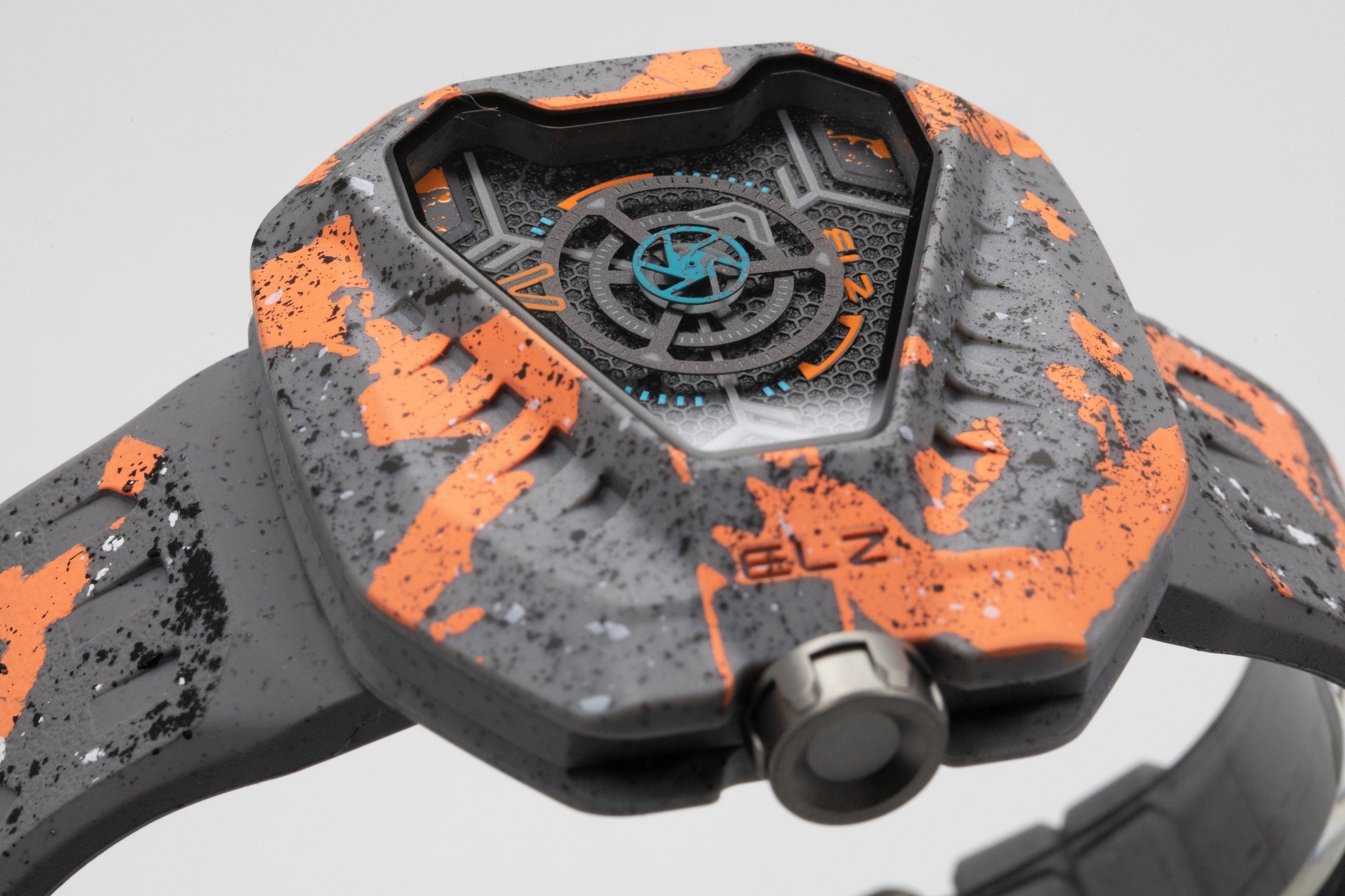 - لون الحزام رمادي مع طبعات النيون البرتقالية