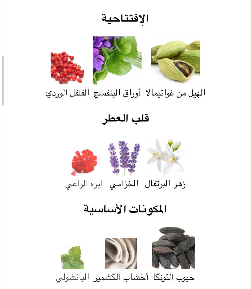 - تابلي دافئ/ اروماتك/ اوزوني/ الزهور البيضاء/ مائي/ حلو/ العنبر/ الفانيليا/ الخزامي/ خشبي