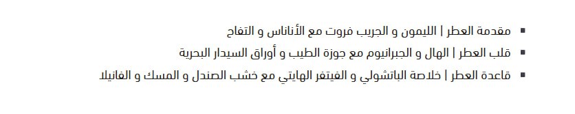 - قلب العطر: الهال. الجبرانيوم. جوزة الطيب.اوراق السيدار