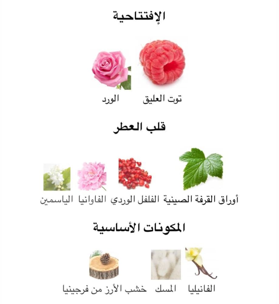 - فاكهي - ورد - حلو - توابل ناعم - اروماتك - زهري - خشبي - منعش - عشبي - مسكي