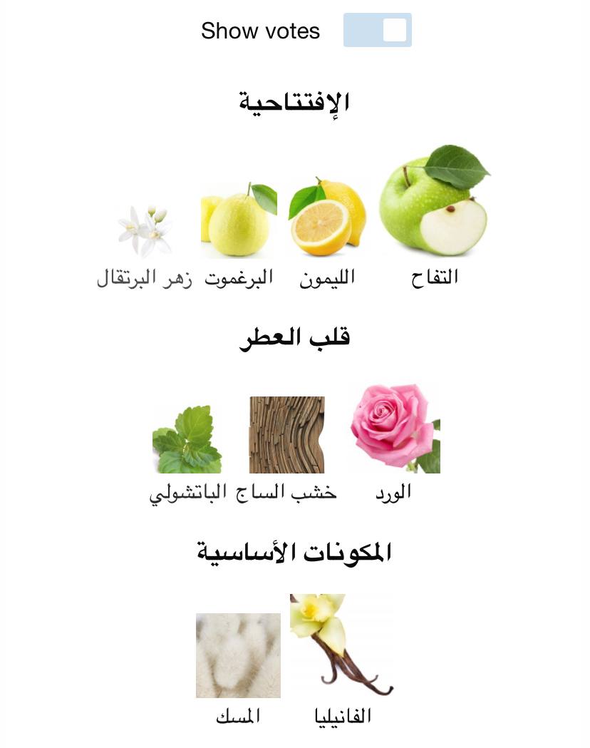 - الحمضيات/الفانيليا/فاكهي/ورد/منعش/ناعم/خشبي/مسكي/عشبي/تابلي منعش