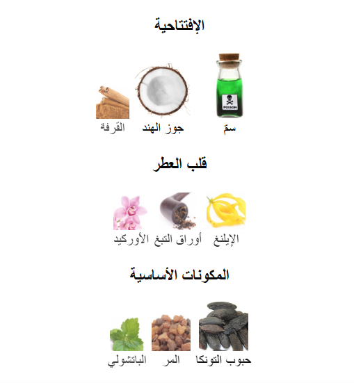 - حلو/جوز الهند/الفانيليا/العنبر/تابلي دافئ/زهور صفراء/لاكتوني/التبغ/خشبي/التبغ