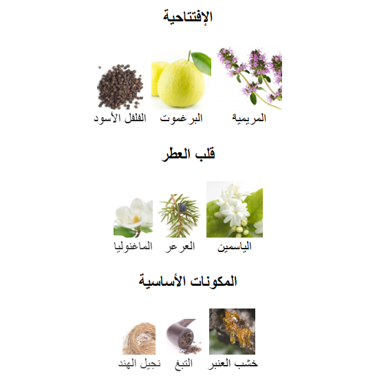 - اروماتك/ تابلي منعش/الحمضيات/الزهور البيضاء/توابل ناعم/خشبي/زهري/العنبر